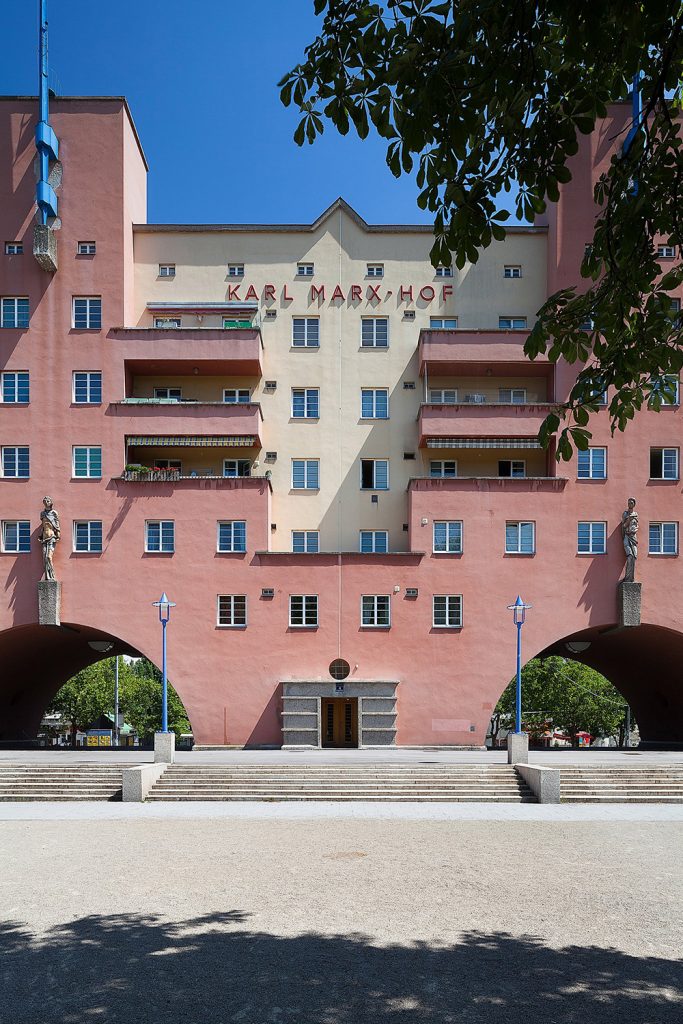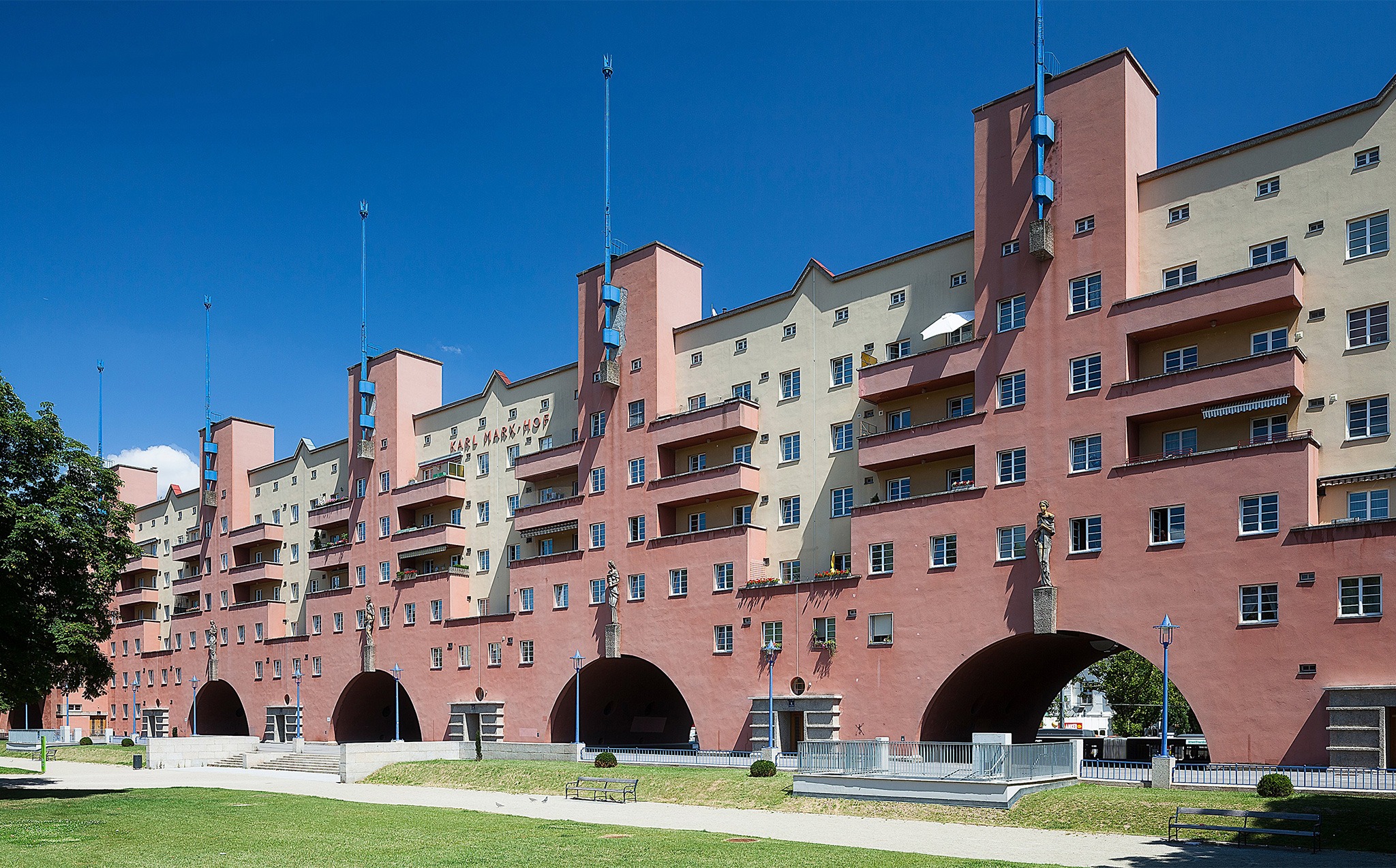 1930 wurde der mehr als 1.000 Meter lange Karl-Marx-Hof im 19. Wiener Bezirk eröffnet. Das Projekt gilt als ikonischer Wohnbau des sozialdemokratisch regierten „Roten Wiens“ vor dem Zweiten Weltkrieg. Die Anlage umfasst 1382 Wohnungen für rund 5.000 Bewohner, wobei weniger als ein Viertel des Areals bebaut ist. Der Rest, über zwei Innenhöfe verteilt, dient als Spielfläche oder Garten. Entworfen wurde der Bau vom Stadtbaumeister Karl Ehn, einem Schüler Otto Wagners. Zu den architektonischen Merkmalen gehören die vier bogenförmigen Durchfahrten sowie Balkone, Turmaufbauten und Fahnenmasten entlang der Straßenfassaden, die Farbgebung in roten, gelben und blauen Tönen sowie sich abwechselnde drei- und viergeschossige Abschnitte, die den Bau gliedern. Durch die Einbindung gemeinschaftlicher Funktionen gilt der Karl-Marx-Hof als paradigmatische „Stadt in der Stadt“.