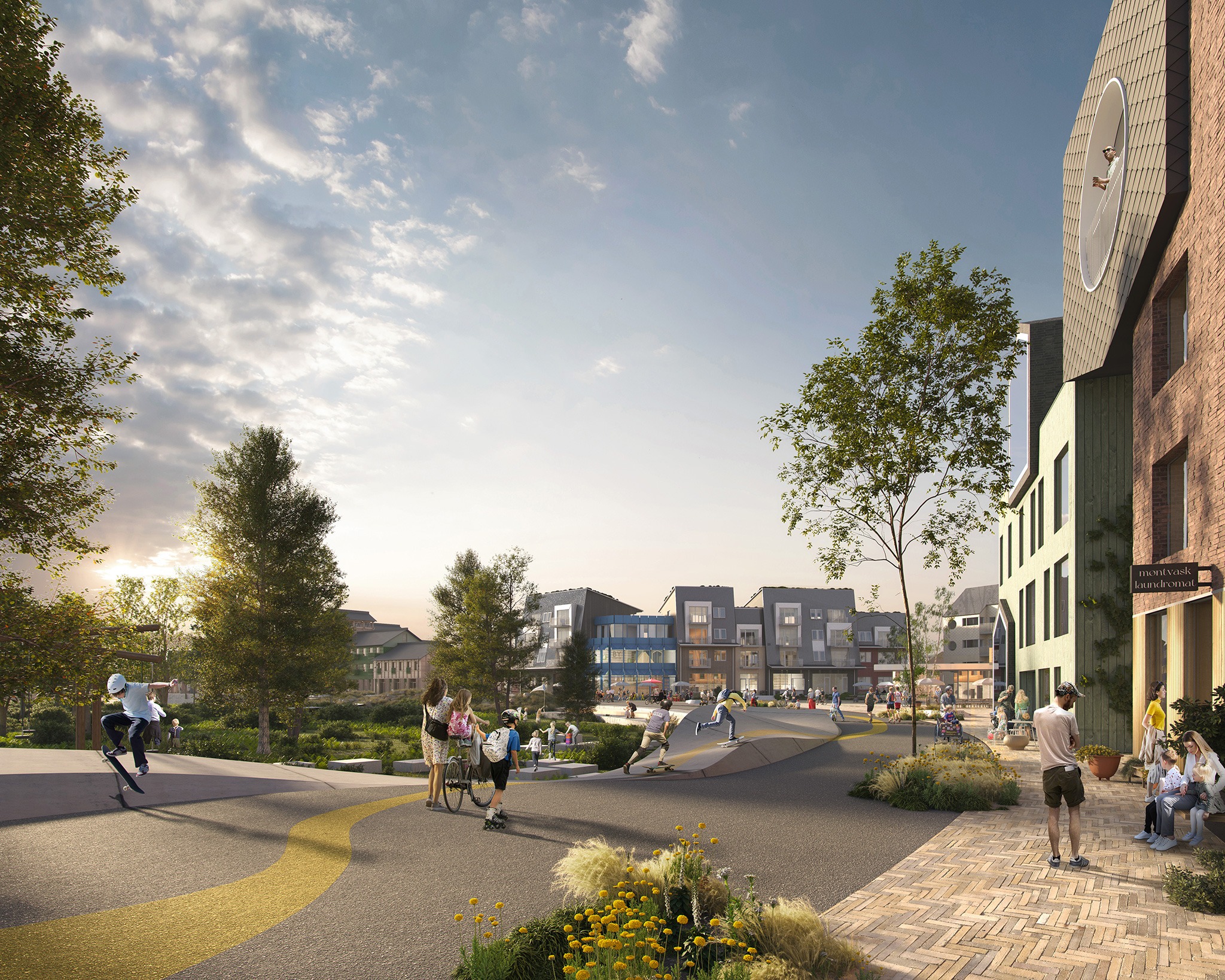 Es kommt nicht oft vor, dass Stadtplanung oder Raumentwicklung in literarischen Vorlagen ihren Anfang nehmen. Im dänischen Billund aber ist dies tatsächlich der Fall. Zumindest hat das Unternehmen KIRKBI sich das obige Zitat von Friedrich Schiller zur Devise genommen, als es um die Entwicklung eines ganz neuen Stadtviertels ging. Das Spiel als Ausweis des Menschlichen – Schiller meinte damit vor allem, dass   weder der bleierne Ernst noch allein der kühle Verstand für uns Menschen handlungsleitend sind oder sein sollten. Wir Menschen wollen spielen. Der Projektentwickler KIRKBI setzt dies nun im Stadtteil Travbyen in dem Sinne um, dass Räume geplant sind, die nicht rationalistisch quadratisch daherkommen, sondern bewusst asymmetrisch wirken, mit versteckten Winkeln und kleinen Gassen. Man darf sich auch mal ein wenig verlaufen. „Wir wollen Orte schaffen, die die Menschen inspirieren und die vielleicht auch ein wenig verspielt wirken“, sagt Christian Nørgaard, Project Director, Real Estate bei KIRKBI, zugleich die Mutterfirma des örtlichen Spielzeugriesen LEGO. Dabei zeigt er auf die Häuser um uns herum, denn wir stehen auf der Baustelle.